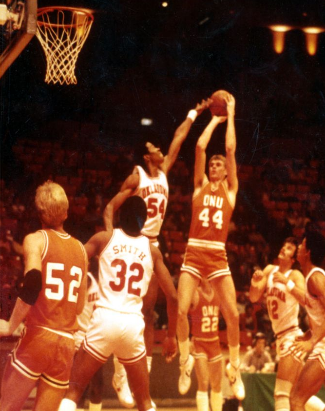 Ohio Northern University's Stan Mories launches a leaping jumper against a taller Oklahoma defender as the non-scholarship NCAA Division III Polar Bears stunned the Billy Tubbs-coached Sooners in Norman, Oklahoma, during the 1980-81 season.